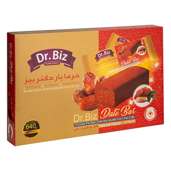 خرما بار طبیعی دکتربیز با استفاده از خرمای درجه یک خوراکی و پس از تایید کنترل کیفیت خرمای ورودی توسط دستگاههای تمام اتوماتیک اروپایی ضمن فرآیند ضدعفونی و پاستوریزه فرآوری و بسته بندی می گردد.